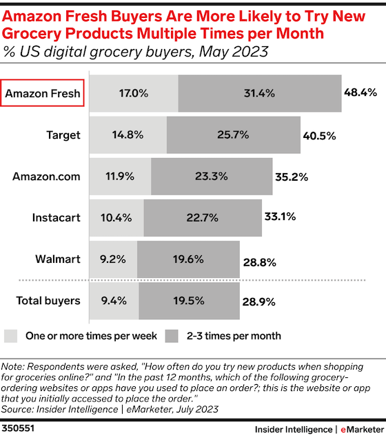 Key stat: Nearly half (48.4%) of Amazon Fresh shoppers try new grocery products multiple times per month, according to an Insider Intelligence survey.