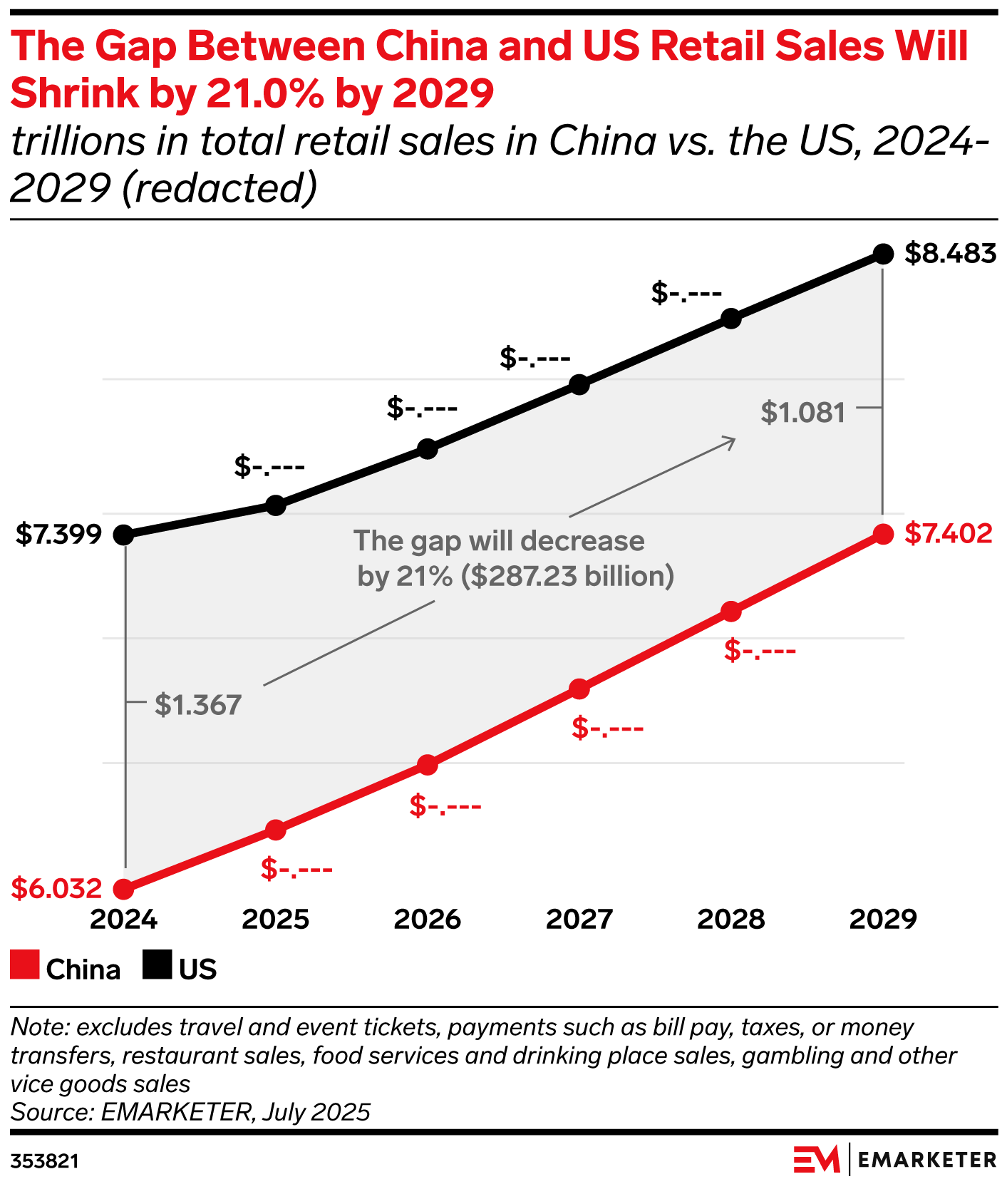 Key Stat: The difference in retail sales between China and the US will shrink by about a fifth between 2025 to 2029, from $1.252 trillion to $1.080 trillion.