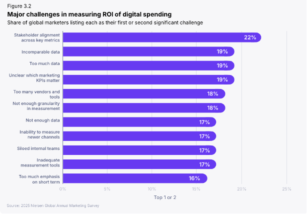 Effective cross-media strategies require holistic data that shows how ad dollars work across channels and which creative assets truly drive results. Nielsen’s 2025 Annual Marketing Report highlights the scope of the challenge: marketers cite stakeholder alignment, data volume, and inconsistent metrics as the top barriers to calculating ROI.