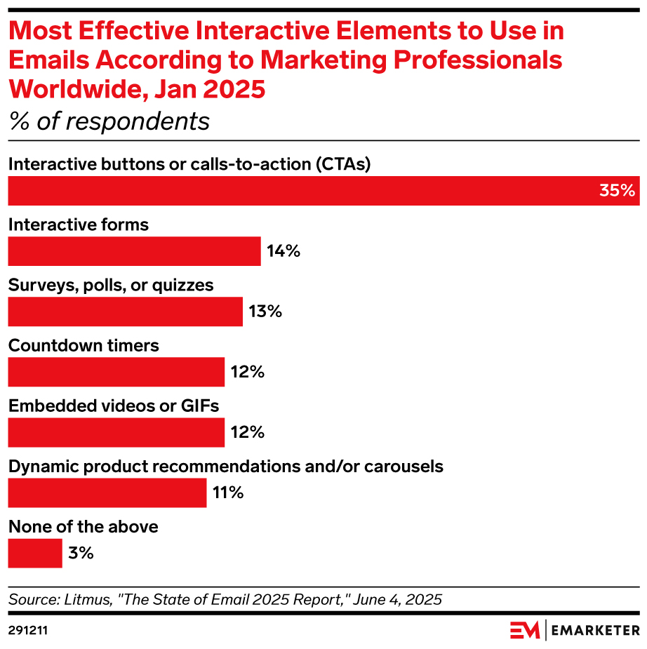 Key stat: Interactive buttons or calls-to-action (CTAs) are the most effective interactive elements to use in emails according to 35% of marketing professionals worldwide, per January 2025 data from Litmus.