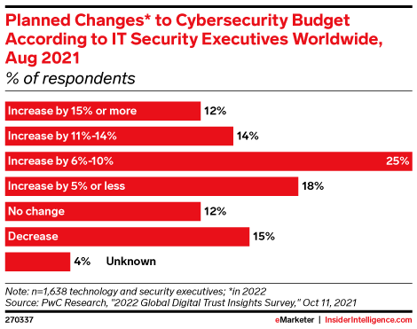 KEY STAT: Cybersecurity spending will grow over the next few years, as 69% of IT execs expect to increase cybersecurity outlays in 2022, while only 15% plan a decrease.