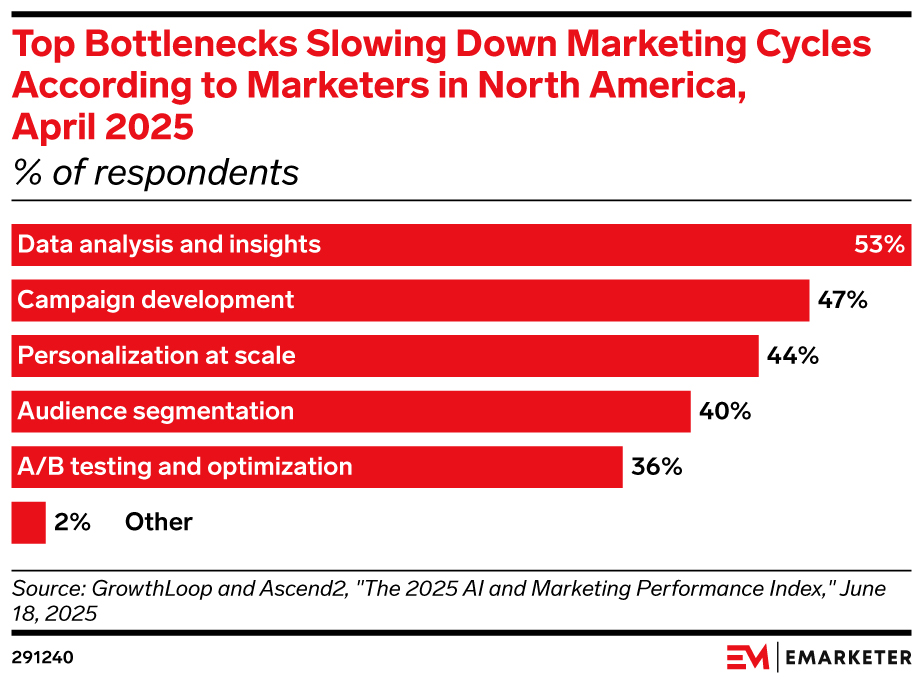 Key stat: 53% of marketers in North America cite data analysis and insights as the top bottleneck slowing down marketing cycles, according to an April GrowthLoop and Ascend2 survey.