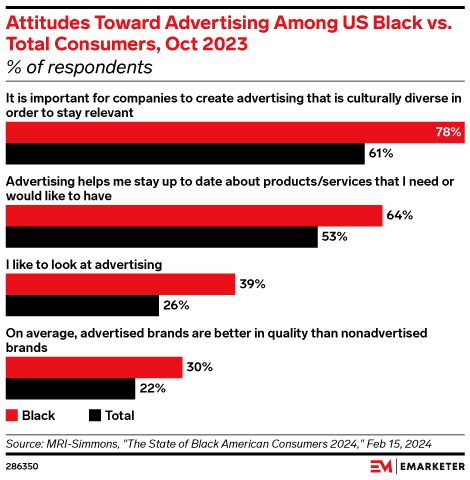 About 64% of Black consumers feel that advertisements keep them informed of products they need or would like to have, according to MRI-Simmons’ February report, “The State of Black American Consumers 2024.” Additionally, Black consumers are around 10 percentage points less likely to judge advertisements harshly on social media. Roughly 56.2% of Black consumers think brands try too hard to look cool on social media compared with 67.6% of non-Black consumers.