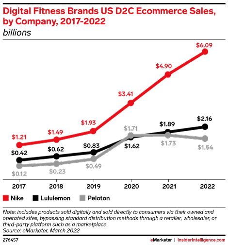KEY STAT: Direct-to-consumer (D2C) ecommerce sales for Nike, lululemon, and Peloton surged 459% from 2017 to 2022.