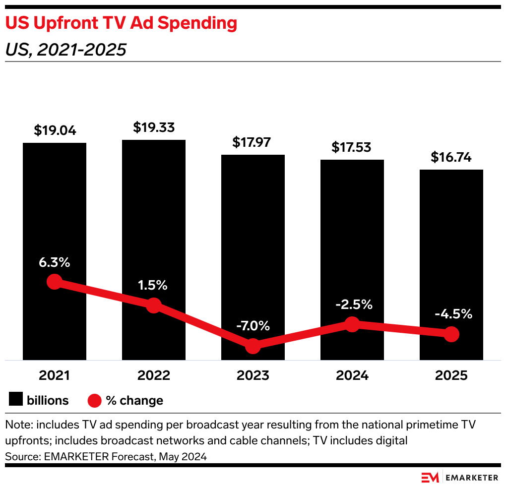 Key Stat: US upfront linear TV ad spending will fall again this year to $17.53 billion, and it will decline further in 2025, per our forecast.