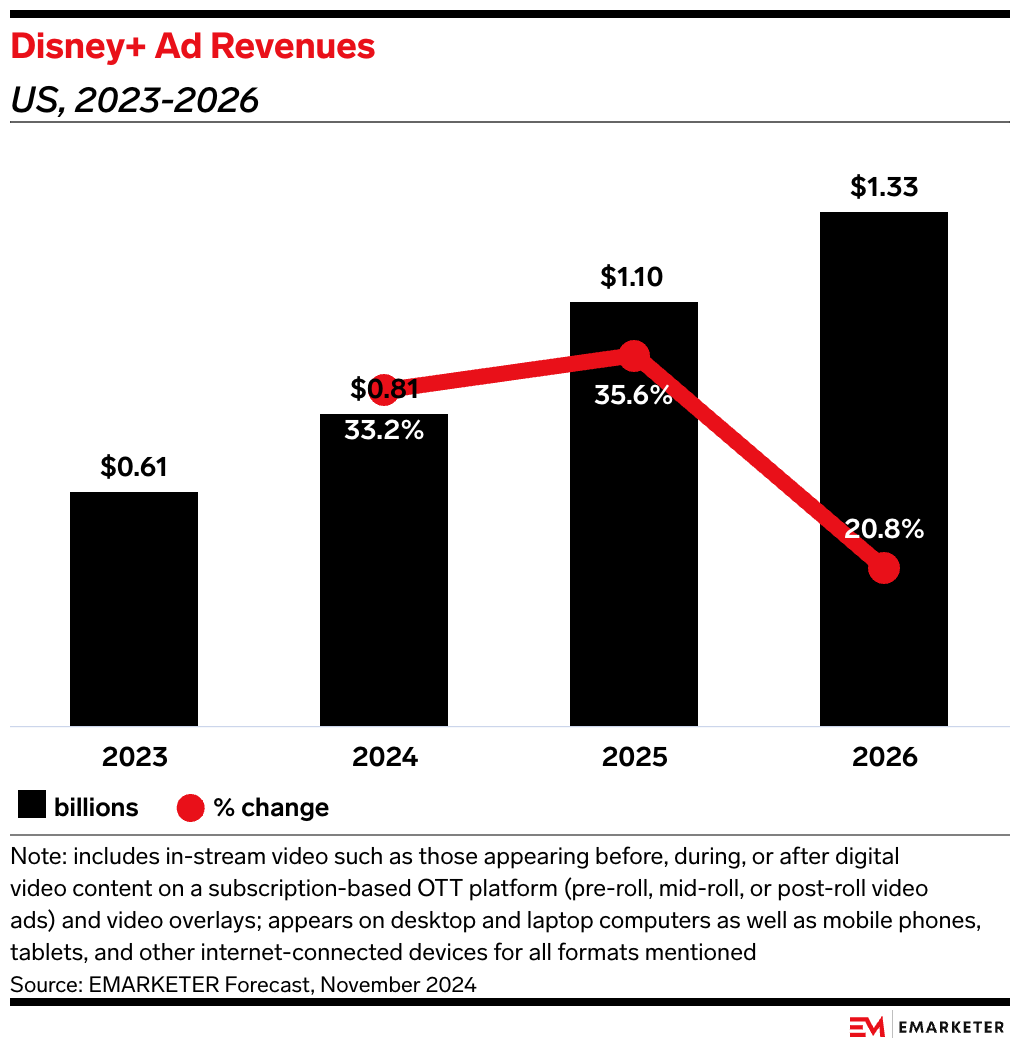 Zooming out: Disney’s streaming business was down 1% QoQ in Q4 2024 while Disney+ ad revenues are growing at a slower rate—so expanding its advertising reach by investing in major cultural moments and keeping the conversation going after these events could be an effective way to offset potential losses.