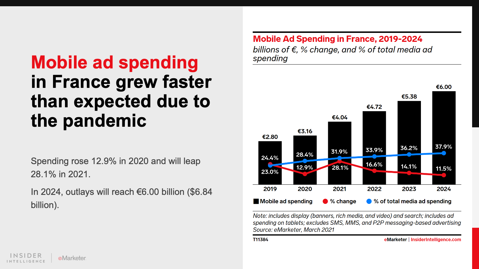 In Germany, as in France, digital ad spending growth was rather anemic in 2020, at 8.0%, compared with our pre-pandemic expectation of 10.0%. But it will recover dramatically this year. We’ve revised our 2021 estimate upward, from 9.0% to 20.0% YoY.
