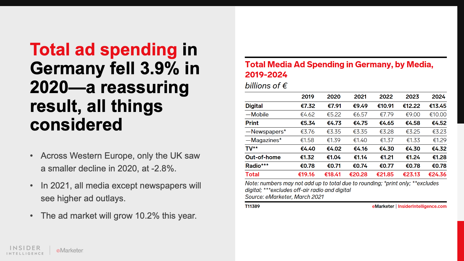 Ad spending on all measured media in Germany fell last year—though not as much as it did in France. In Germany, total ad spending slipped by 3.9% to €18.41 billion ($20.99 billion) in 2020. But it should rise by 10.2% to €20.28 billion ($23.12 billion) in 2021, as one of Europe’s most resilient economies regains momentum.