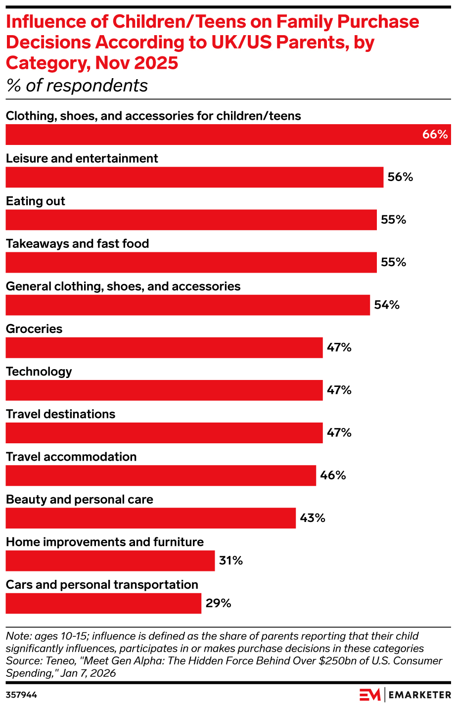 Key stat: 66% of UK/US parents say their children ages 10-15 significantly influence clothing, shoes, and accessories purchases, making it the top category where Gen Alpha sways family spending, according to a November 2025 study from Teneo.