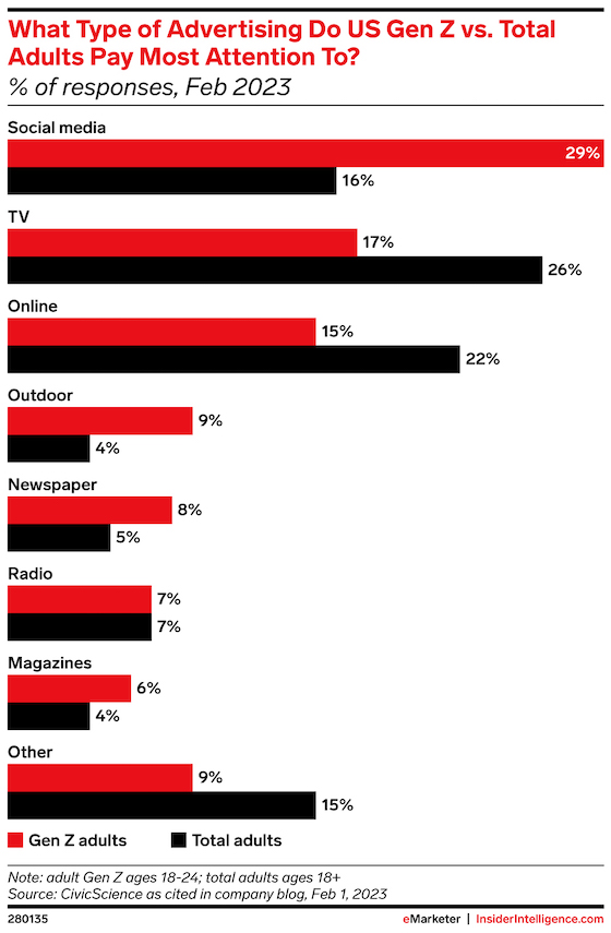 Gen Z adults are more likely to pay attention to social media advertising than US adults overall, according to CivicScience. By comparison, the general adult population tends to notice other online ads and TV commercials.