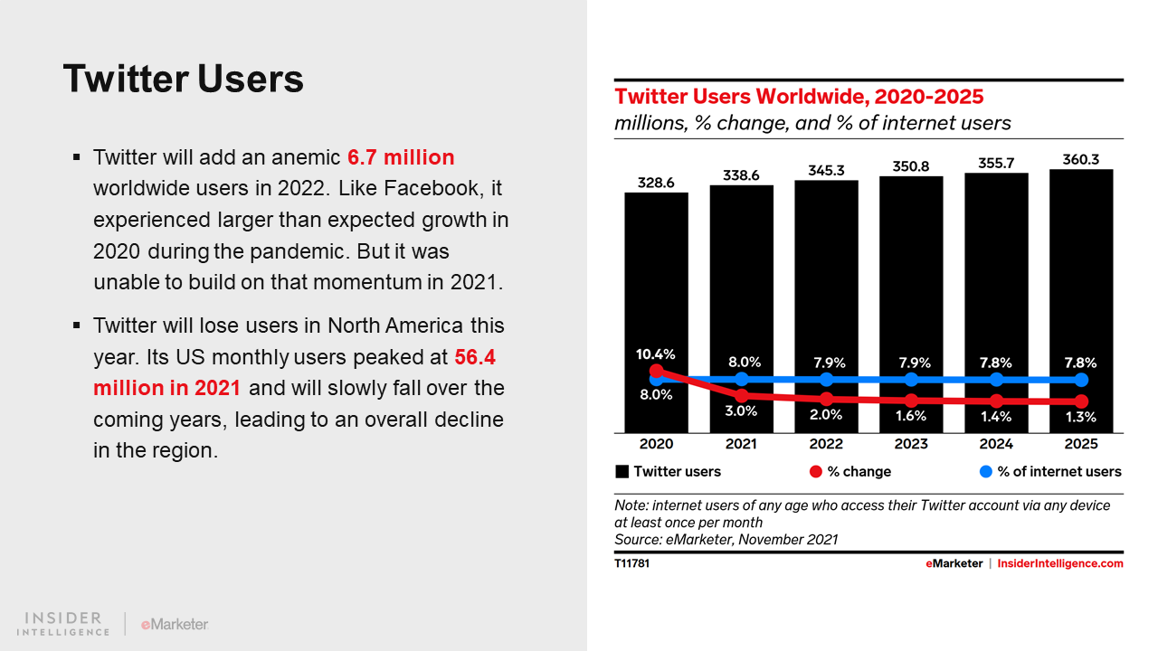 Two opposing developments sum up the state of social network usage in 2022: slowing global growth after unexpected pandemic gains and the rise of TikTok as a major force in social media. The intersection of these trends means that future growth for the main social platforms will come not from wooing first-time users but, increasingly, from stealing each other’s.