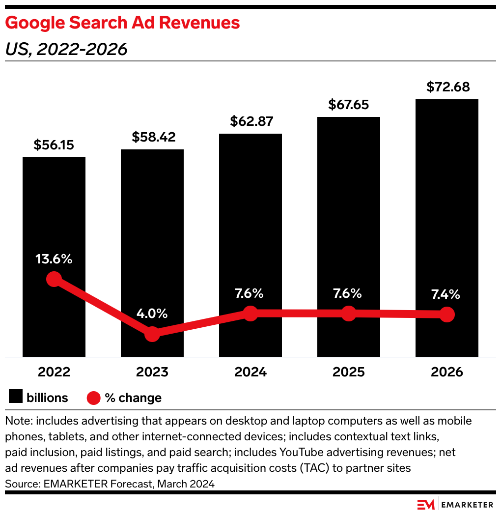 “Google’s loss in its search antitrust trial could be a huge deal—depending on the remedy,” said EMARKETER senior analyst Evelyn Mitchell-Wolf. “A forced divestiture of the search business would sever Alphabet from its largest source of revenues. But even losing its capacity to strike exclusive default agreements could be detrimental for Google.”