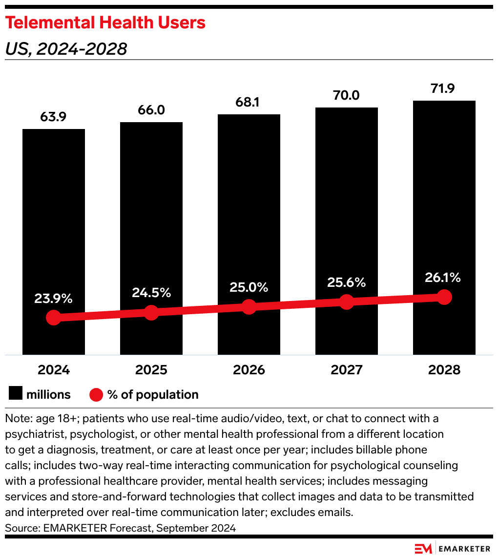 • We forecast that just over 26% of US adults will be using telemental health services by 2028, up from the nearly 24% expected to use them this year.