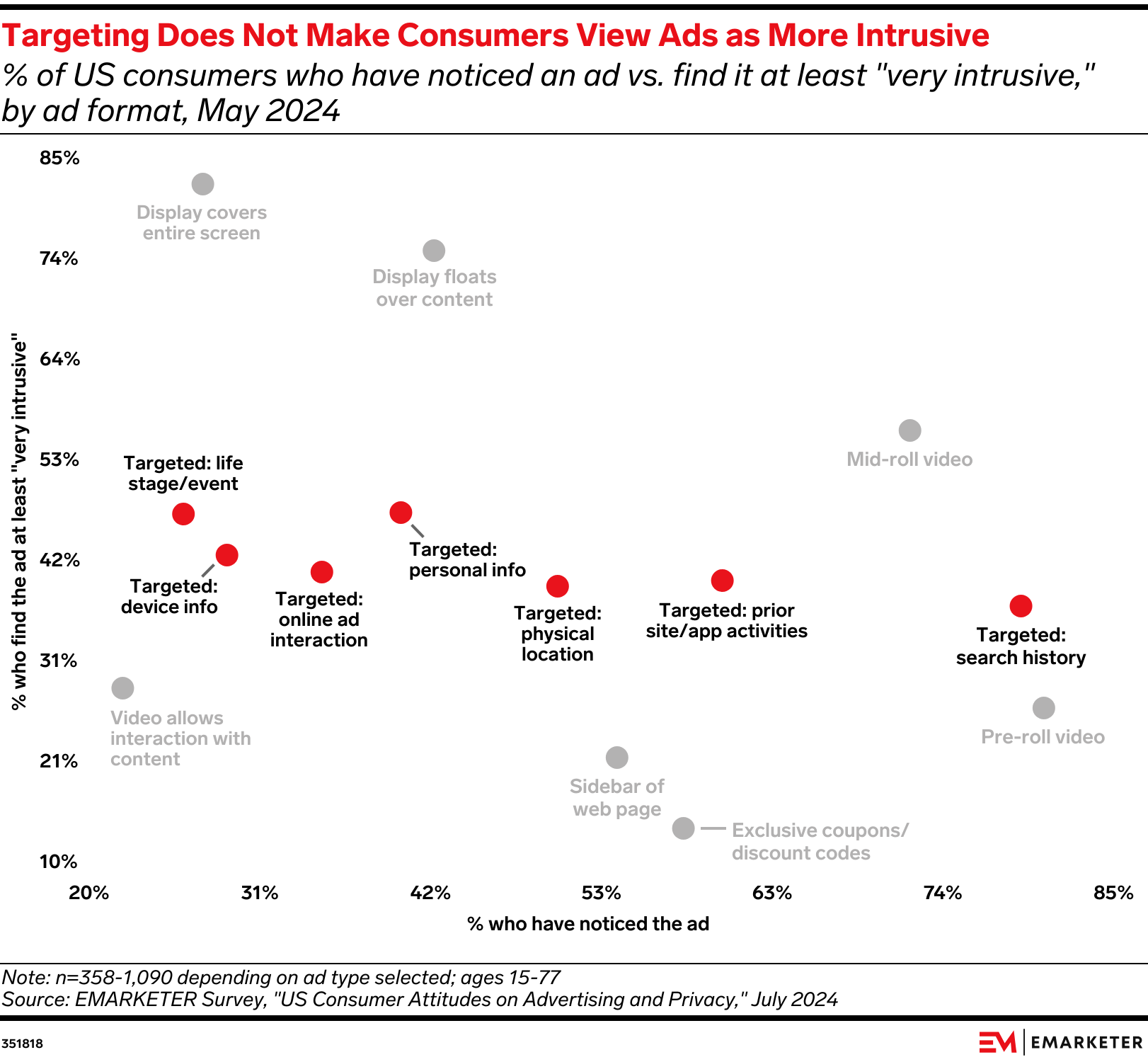 Key Stat: No ad targeting method is viewed as “very intrusive” or worse by a majority of US consumers, per our survey.