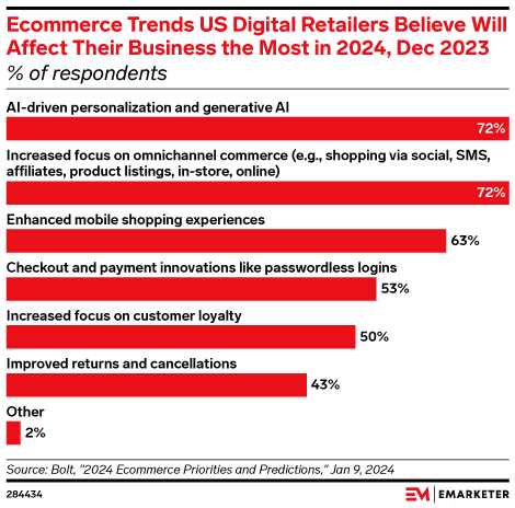 Key Stat: Over 70% of US digital retailers believe AI-driven personalization and genAI will affect their business in 2024, according to a December 2023 survey by Bolt—making hyper-personalization as important as omnichannel.