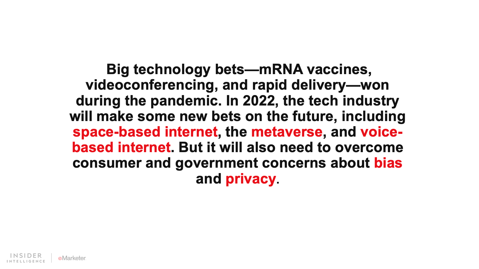 Big technology bets—mRNA vaccines, videoconferencing, and rapid delivery—won during the pandemic. In 2022, the tech industry will make some new bets on the future, including space-based internet, the metaverse, and voice-based internet. But it will also need to overcome consumer and government concerns about bias and privacy.