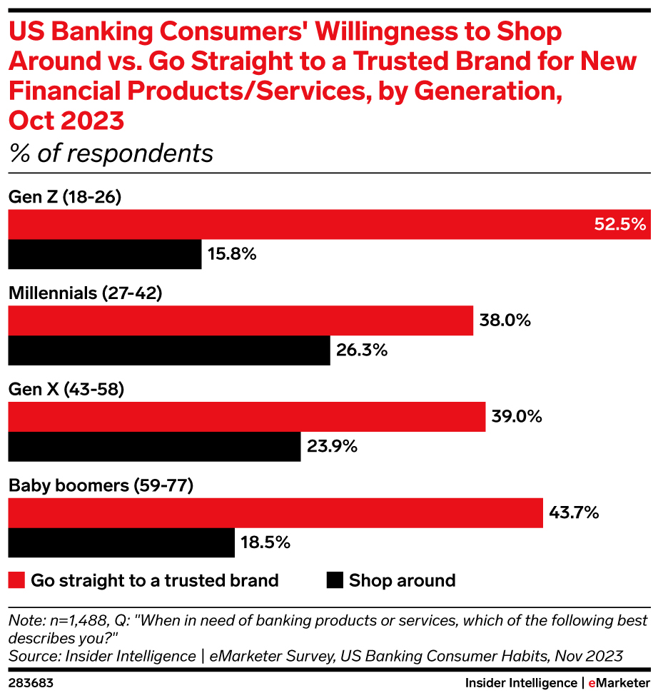 • Gen Zers were the most likely to seek financial advice from their FIs, at 56.3%. Millennials were the least likely (29.5%). All generations were most likely to turn to family and friends, but at least 69% respondents across all generations said they’d trust advice from their bank.