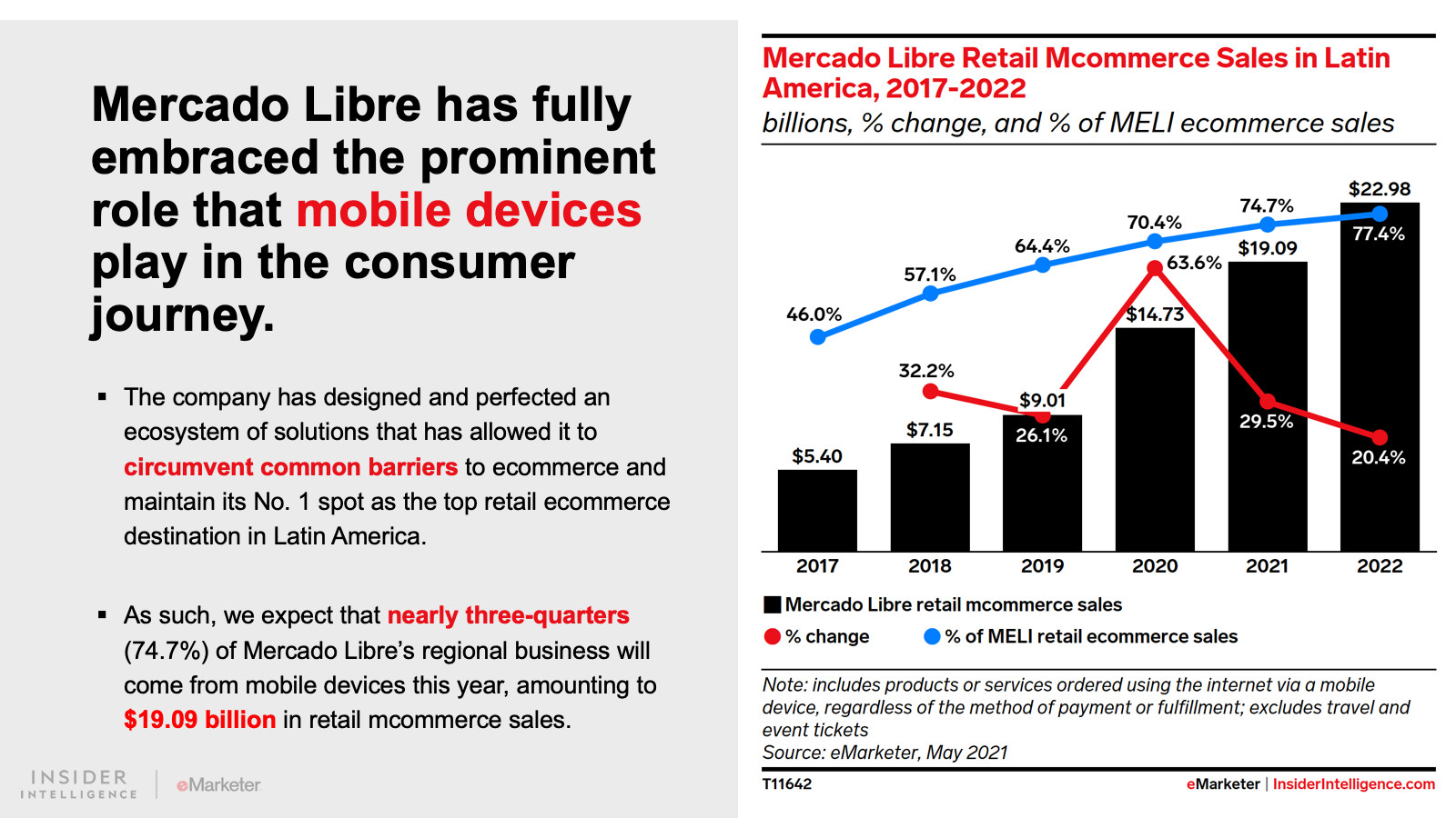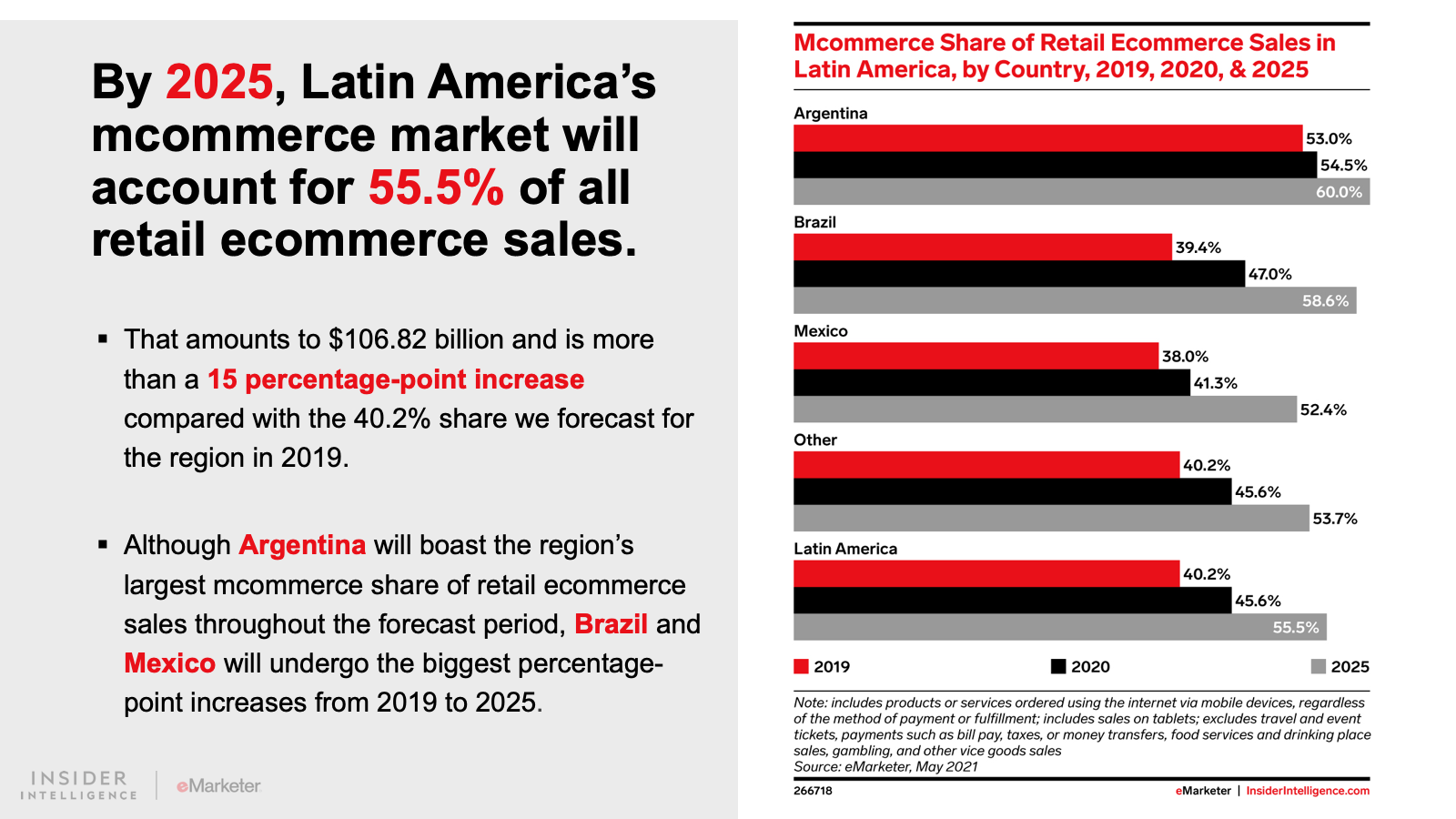 From 2016 to 2019, mobile’s share of retail ecommerce sales in Latin America nearly doubled from 20.9% to 40.2%. This year, we forecast that nearly half (48.8%) of retail ecommerce sales will take place on mobile devices.