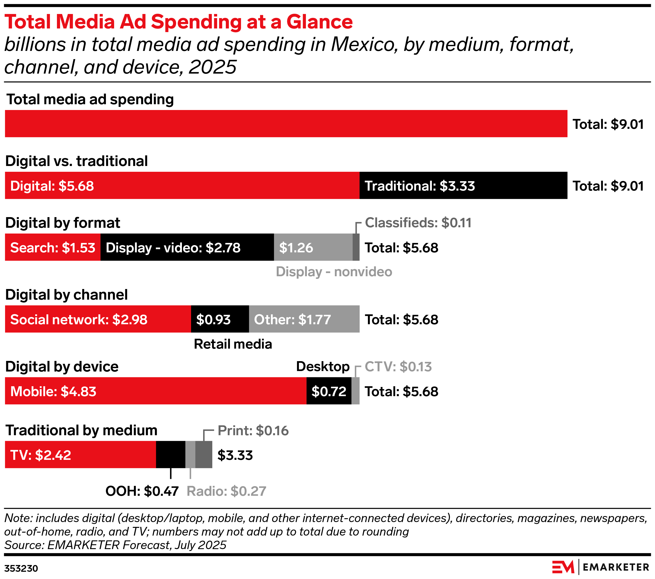 This is EMARKETER’s inaugural 2025 “Mexico Ad Spending Benchmarks.” In each edition of this series, we look at the latest forecasts for total media ad spending and digital ad spending by format, device, and channel. Each deck in this series gives marketers the data they need to benchmark their own spending.