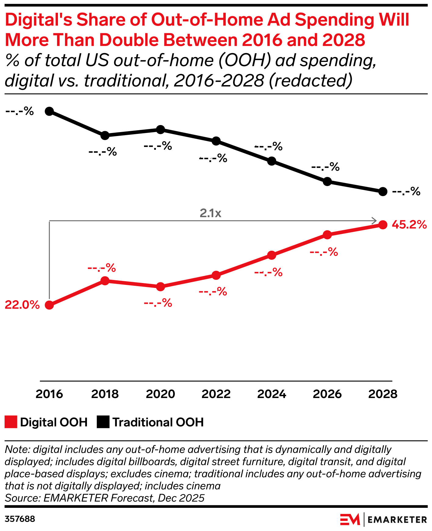 Key Stat: Digital out-of-home (DOOH) will account for 45.2% of total OOH ad spending in 2028, up from 22.0% in 2016.