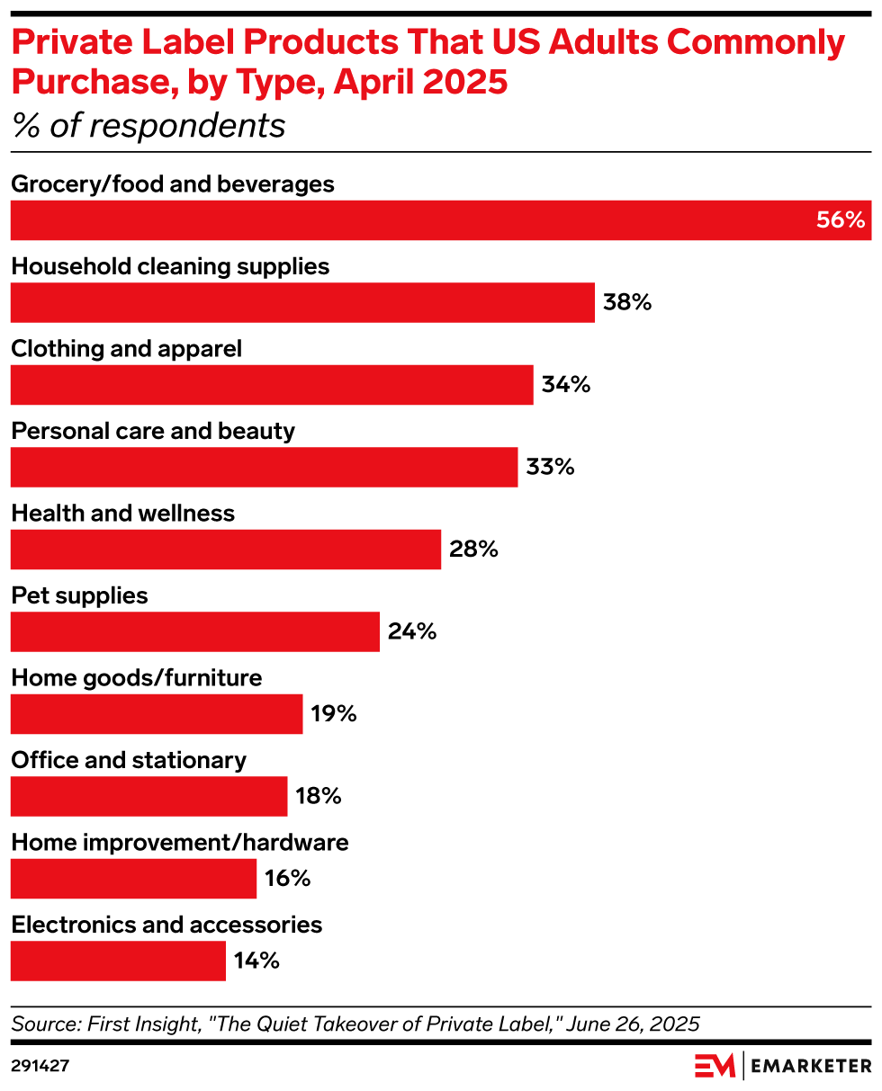 Key stat: Over half (56%) of US adults commonly purchase private label grocery/food and beverage products, the most popular category of private label purchased, according to April 2025 data from First Insight.