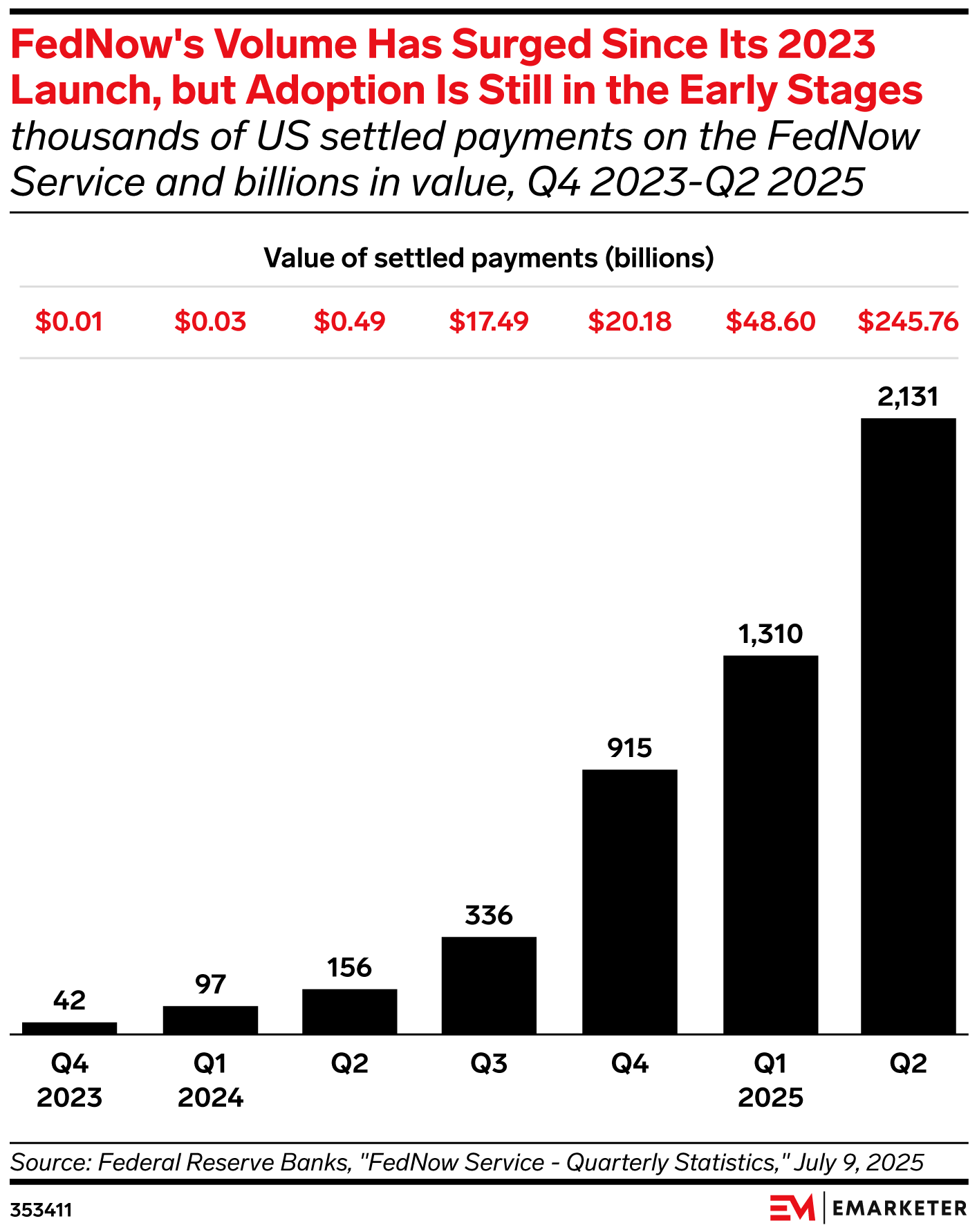 Key Stat: FedNow’s quarterly volume has grown almost 50 times since its first full quarter in Q4 2023, but adoption remains limited with only 2.1 million transactions occurring on the network in Q2 2025, per the Federal Reserve.