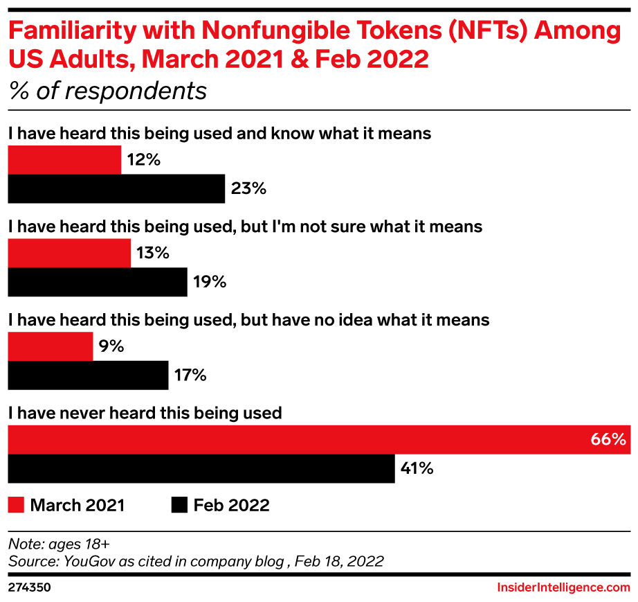 2. Public apathy: 41% of US adults have never heard of NFTs, according to YouGov, and just 3% of adults in Great Britain said they would feel more positively about a company if it started offering the digital tokens.