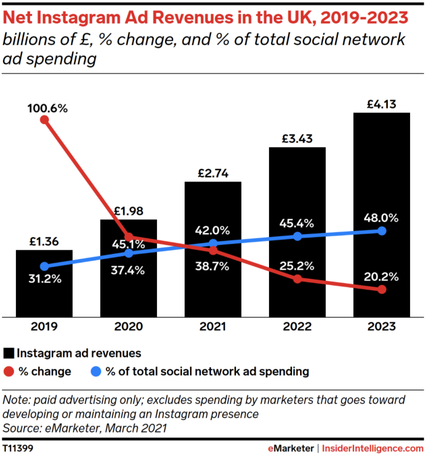 Such growth might have influenced Facebook’s new Instagram strategy, which concentrates heavily on digital video. Instagram now offers five separate places users and marketers can incorporate video: the feed, Stories, Live, Reels, and IGTV (recently launched in the UK). While there’s little differentiation among the products, the strategy appears to have paid dividends for Instagram: The platform’s ad spending rose by 45.1% in 2020 to £1.98 billion ($2.54 billion), growing slightly slower than our pre-pandemic estimate of 47.9%.