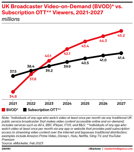 KEY STAT: This year, broadcaster video-on-demand (BVOD) viewer numbers will surpass subscription OTT (sub OTT) viewers for the first time, and that gap will continue to grow. Advertiser options will grow with it.