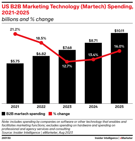 KEY STAT: Following a rush during the pandemic, B2B martech spending growth will slow to 12.7% YoY in 2023, down from 18.5% in 2022.