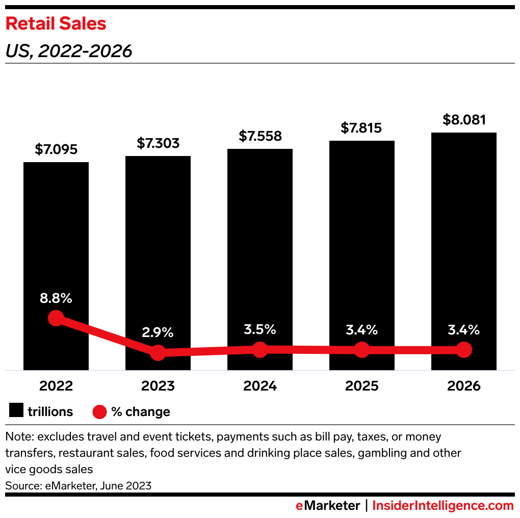 The forecast: US retail sales will grow 2.9% year-over-year (YoY) this year to $7.303 billion, per our US Total Retail Sales forecast. We expect growth to accelerate to 3.5% next year.