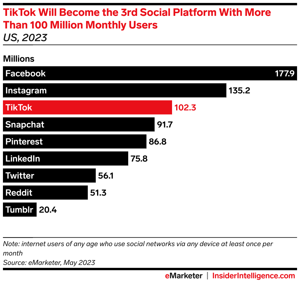 KEY STAT: TikTok will have more than 100 million monthly users in 2023. It will reach this milestone just six years after launching in the US—faster than the eight years it took Instagram.