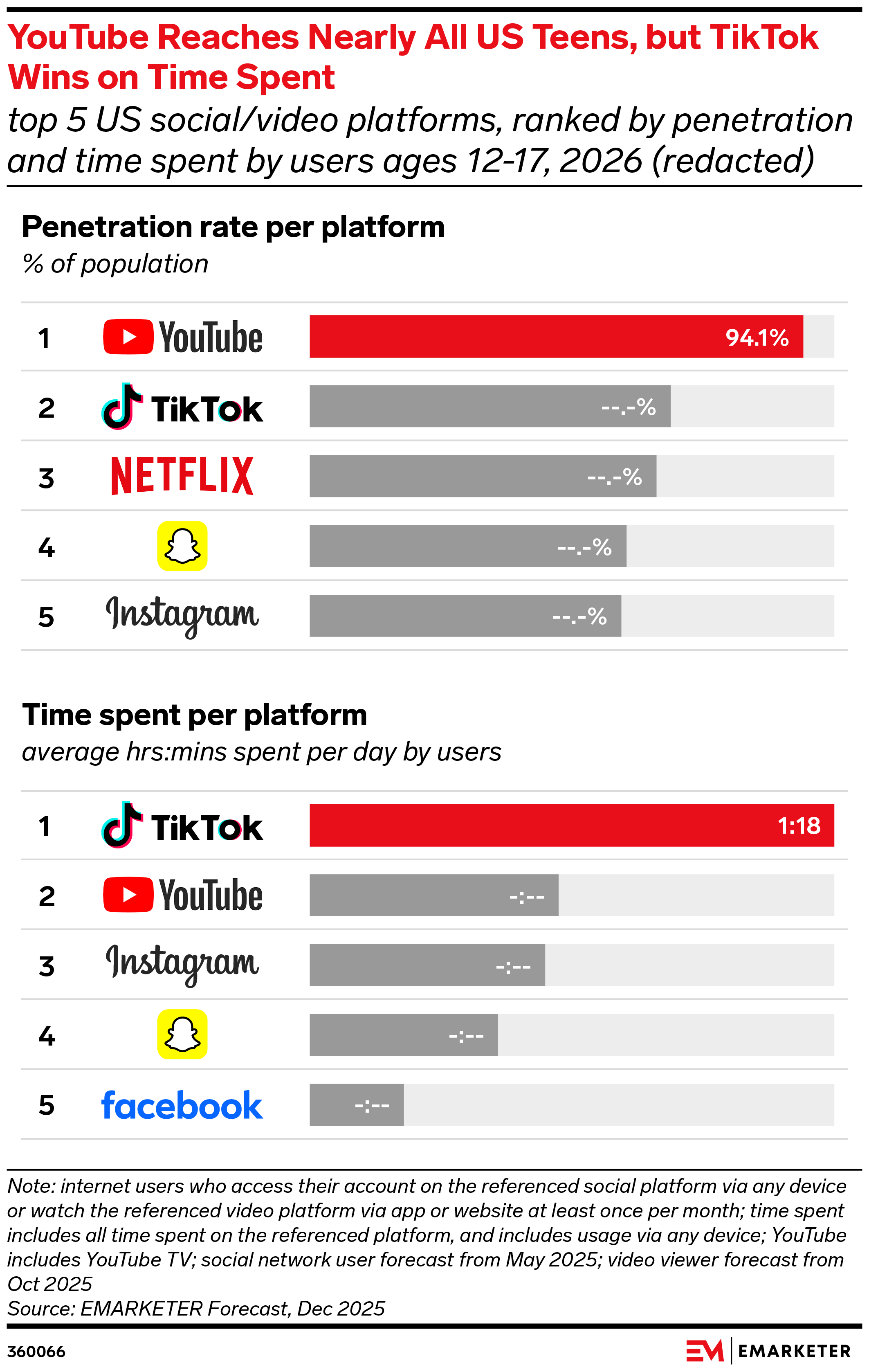 Key Stat: TikTok will dominate time spent among teens in 2026 at 1 hour and 18 minutes (1:18) per day, while YouTube will have the greatest reach (94.1%).