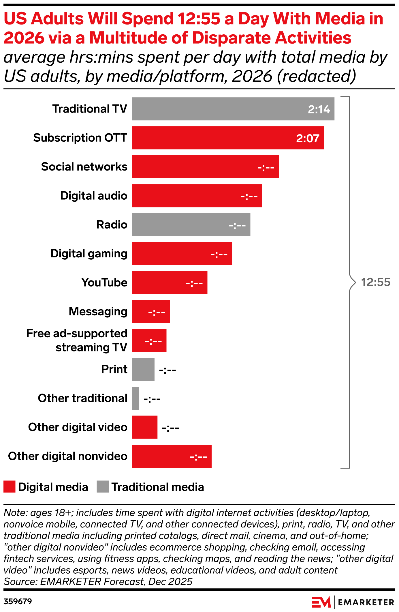 Key Stat: Adults will spend 2 hours and 14 minutes (2:14) per day with traditional TV in 2026—the final year that linear TV will be the leading media activity in the US. Next year, subscription OTT (sub OTT) streaming will take the lead.