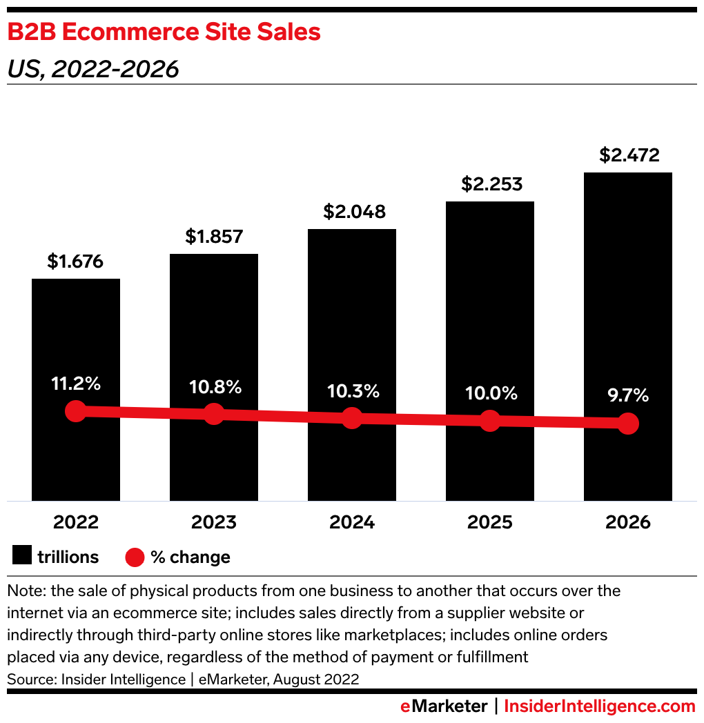 • US B2B ecommerce site sales will be $1.857 trillion this year, per our forecast, a 10.8% increase over last year. We expect double-digit growth will continue through 2025, before it slows slightly to 9.7% in 2026.