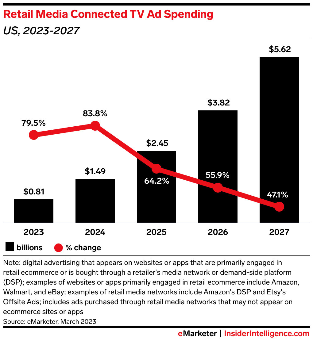 The big takeaway: It’s unsurprising that Walmart is deepening its CTV presence. While CTV will make up just 1.8% of total retail media spend in 2023, the market is growing rapidly: We expect retail media CTV ad spending to grow by 79.5% this year. CTV is also expected to be the fastest-growing ad channel this year, making it an attractive target for retailers looking to grow their ad business.