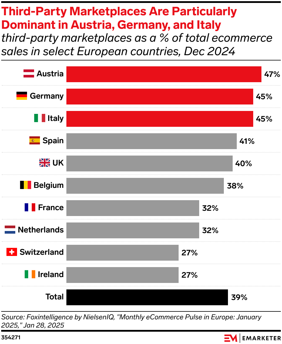 Key Stat: Third-party marketplaces have a 39% share of total ecommerce sales in Europe—rising to 47% in Austria and 45% in Germany and Italy.