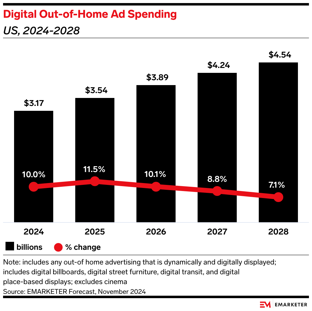Despite DOOH’s unique advertising opportunities, it is still a somewhat underused ad channel. With 10% of brands and agencies prioritizing DOOH for 2025, per InMarket, that’s a sign that some brands could seize valuable space and forge relationships with providers.