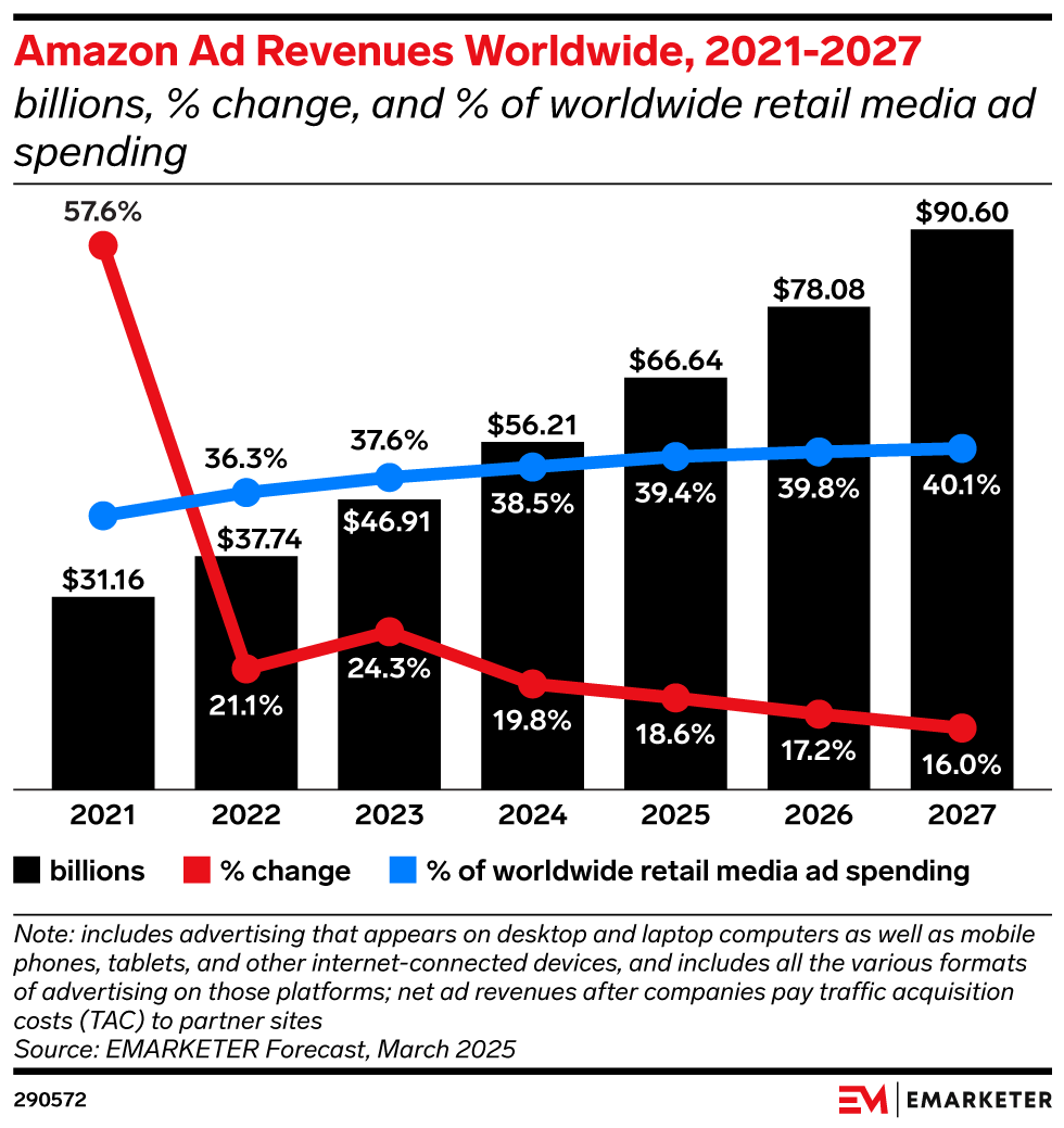 Amazon’s retail media ad revenues will exceed $60 billion, per WARC: The change represents its steady growth despite broader economic setbacks.