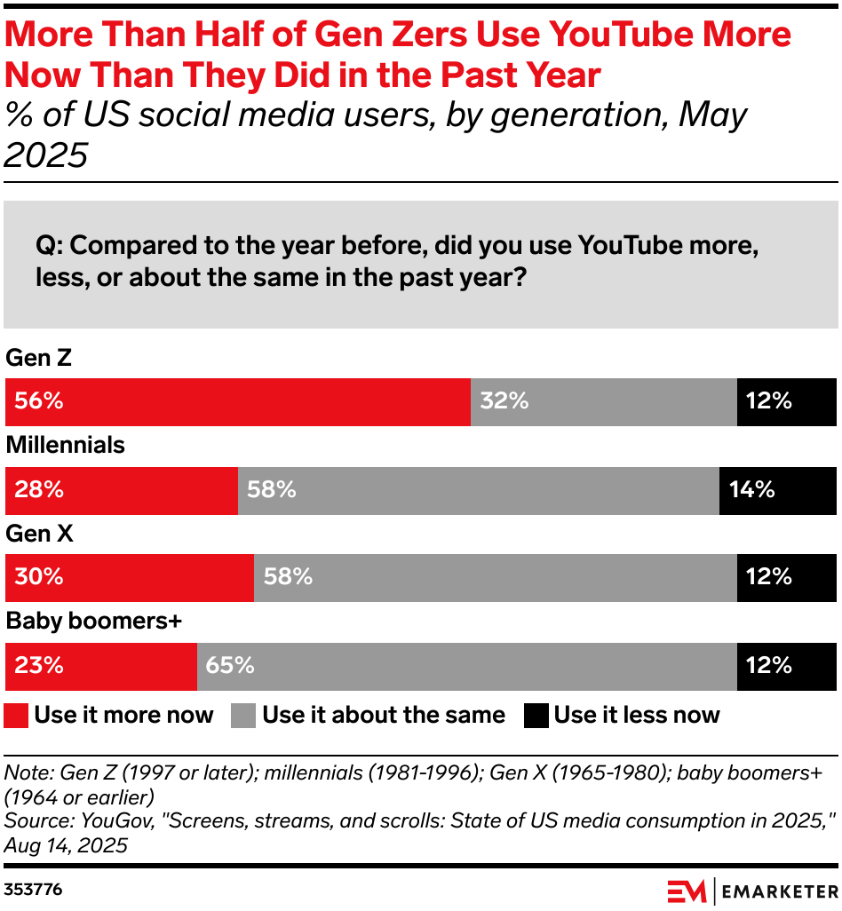 YouTube is an effective channel for reaching Gen Zers as use and creators influence expand, per our 2025 Gen Z Social Media Usage report. Over half (56%) of Gen Z social media users are spending more time on YouTube than they did a year ago, per YouGov. YouTube’s momentum with Gen Z shows its evolution from an entertainment hub to a discovery and shopping engine. Brands need to not only show up, but also design for searchability, optimize creator partnerships, and explore cross-screen viewing and messaging outreach.